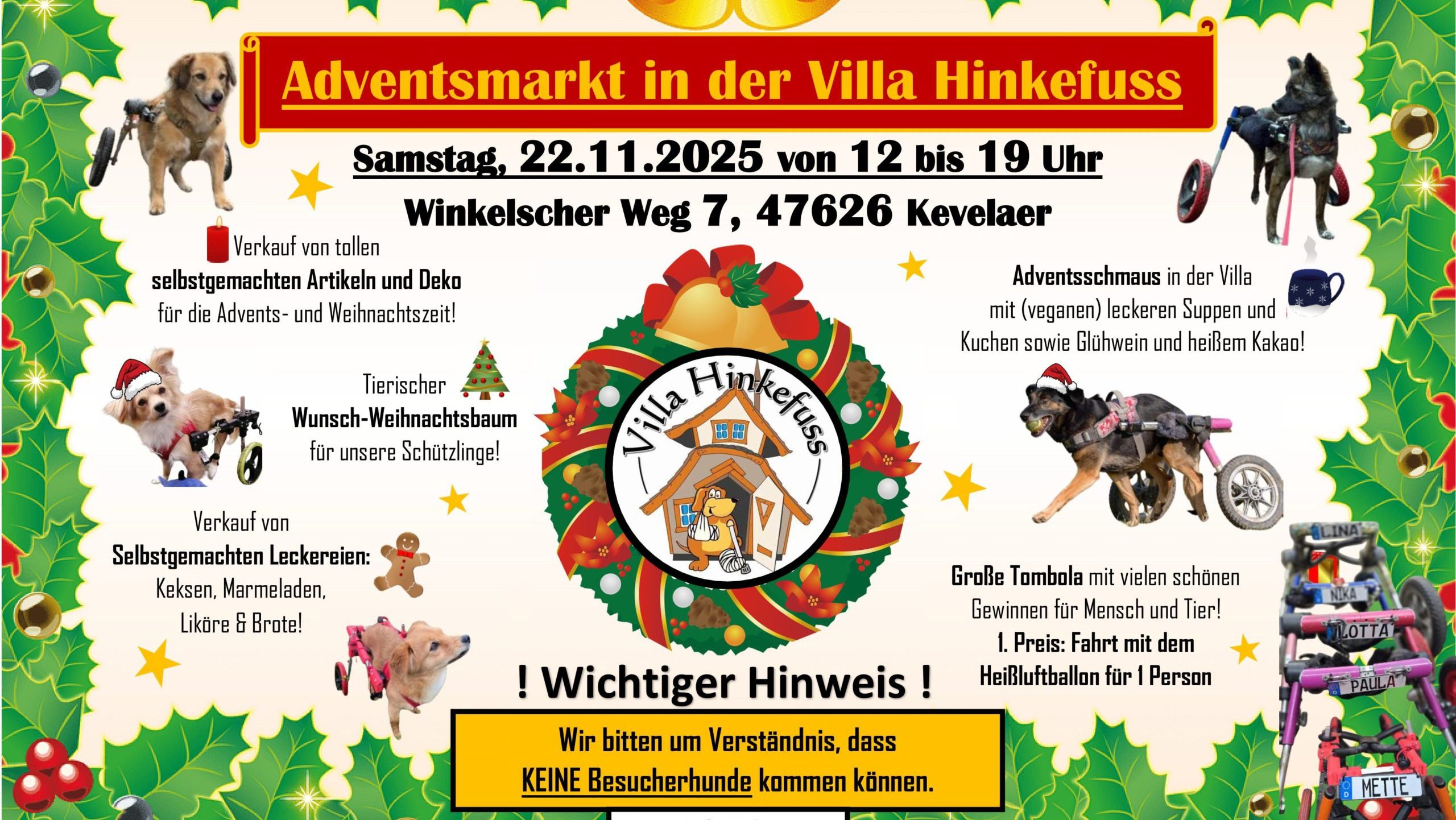 Herzliche Einladung zum Adventsmarkt in der Villa Hinkefuss! Besuchende erwartet eine festliche Atmosphäre mit vielen Highlights: Eine große Tombola mit tollen Preisen für Mensch und Tier – als Hauptgewinn winkt eine Fahrt mit dem Heißluftballon! Außerdem gibt es eine Vielzahl an selbstgemachten Artikeln und Dekorationen rund um Advent und Weihnachten an. Für das leibliche Wohl […]